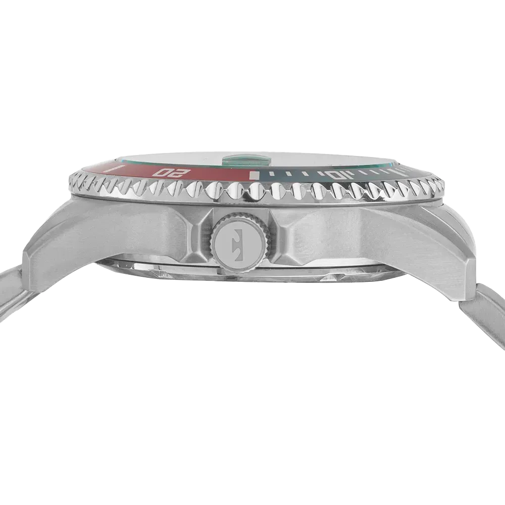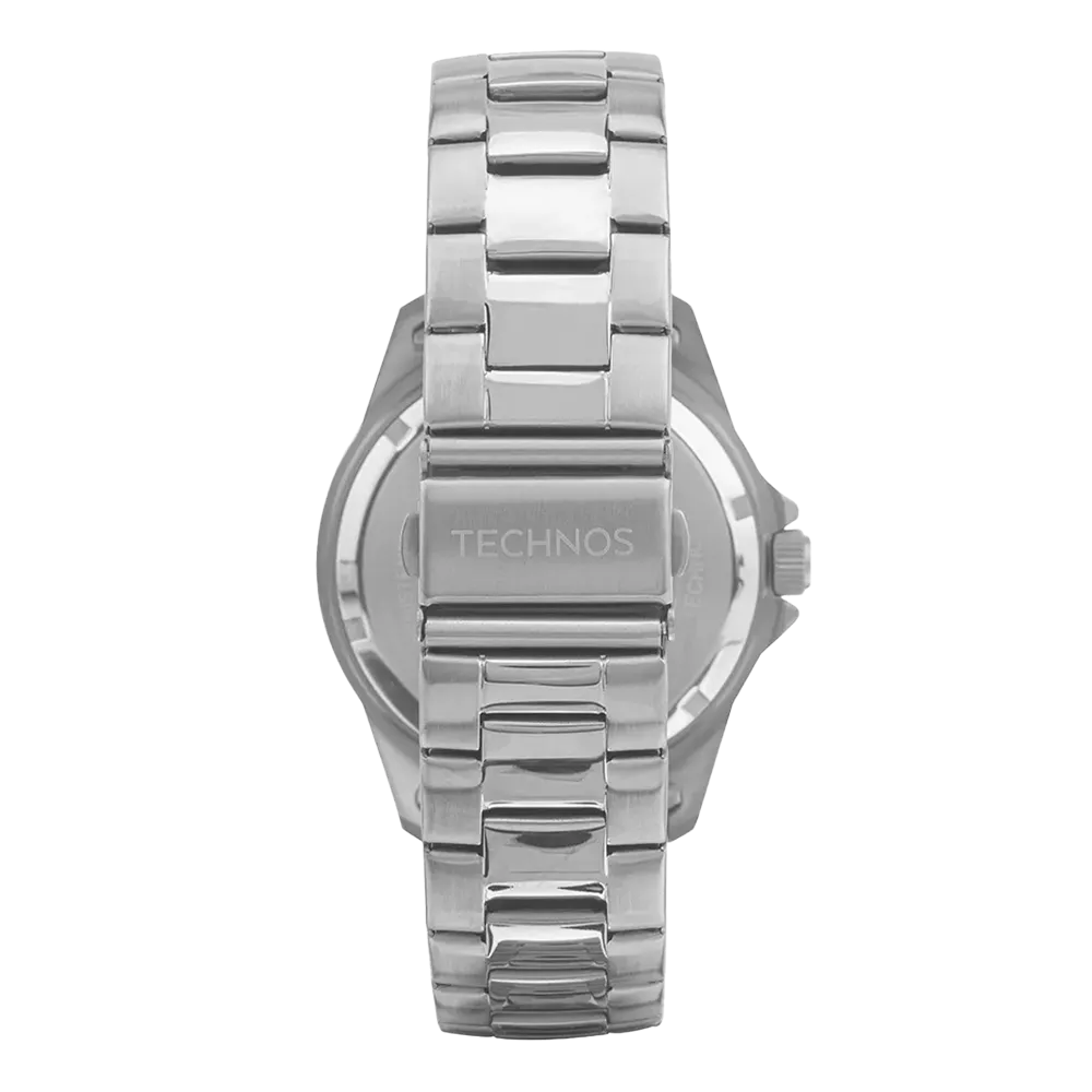 Este Diver possui elementos indispensáveis para aventuras submersas, como o aro externo giratório com acabamento corrugado e lente antireflexo com lupa de calendário, além do mostrador com ponteiros e marcadores de hora luminescentes. Seu mostrador ainda conta com formas geométricas nos marcadores de hora para facilitar a leitura. Produto 100% em aço inoxidável, com máquina quartz japonesa Miyota, calendário e resistência à água de até 150 metros.