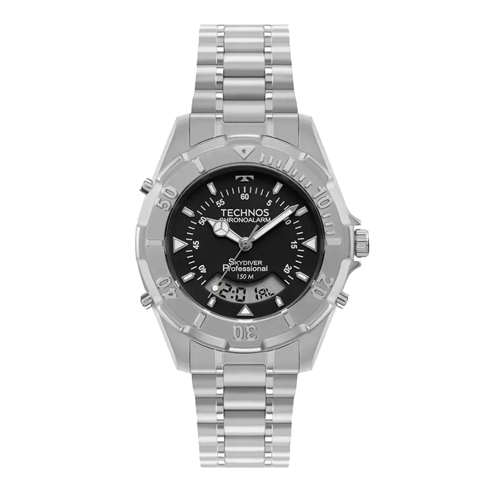 O Skydiver é um relógio clássico da Technos, inspirado no universo paraquedista, na liberdade de saltar no desconhecido e no sonho de dominar a gravidade. Desde 1986, conquista o pulso de gerações de exploradores com seu design imponente e seu mostrador inconfundível. Possuem aro externo giratório e resistência a água de 150m.